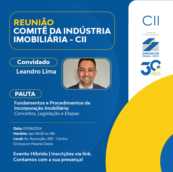 No dia 7 de agosto, às 16h30, o Comitê da Indústria Imobiliária (CII) do Sinduscon Paraná Oeste realizará sua próxima reunião em formato híbrido, permitindo a participação tanto presencial quanto on-line. O evento, que ocorrerá na sede do Sinduscon, em Cascavel, promete ser uma oportunidade valiosa para os profissionais do setor imobiliário.